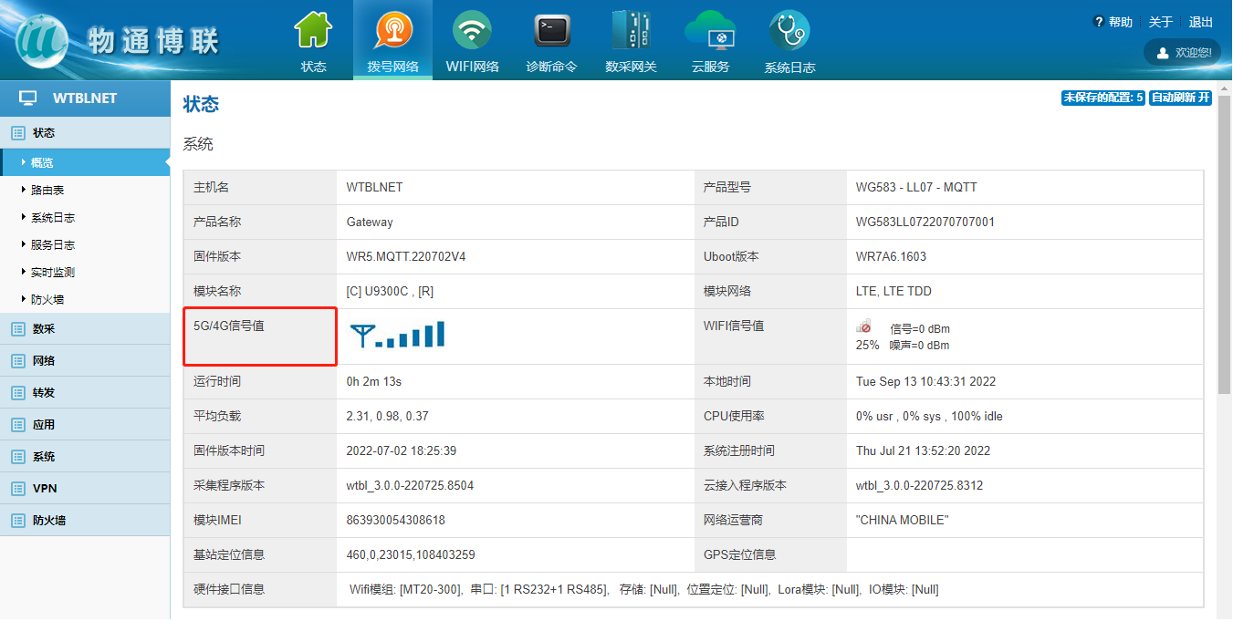 通常支持5G/4G/3G上网的网络隔离器的出厂配置是5G/4G/3G流量卡上网的模式,使用上电前将流量卡、天线(5G/4G/3G天线延长线的SMA头是针,网络隔离器上的连接头是孔)装上就可以了。也可以进入网络隔离器的WEB界面,查看5G/4G/3G信号值以及5G/4G/3G网络联网情况,如下图: