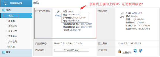 P.s.验证网关已联网情况:状态-概率-网络-IPV4WAN状态---获取到IP地址