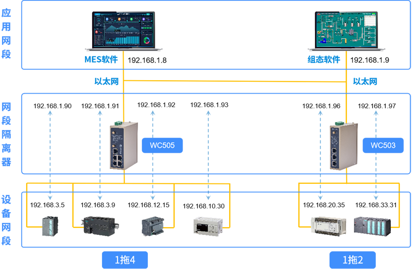 威九国际·WC系列网段隔离器(NAT转换网关)适用于生产网络对于PLC、HMI、CNC、DCS、MES等设备和系统进行网段隔离和IP转换,从而实现设备与设备,设备与系统之间的有效防护隔离,顺利获得IP的转换实现统一化的IP规划;广泛应用于智能工厂、矿山、油井等生产网络设备接入场景。