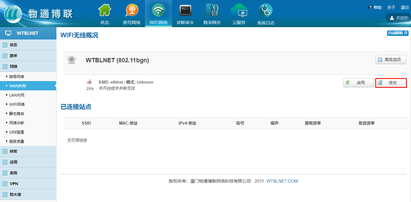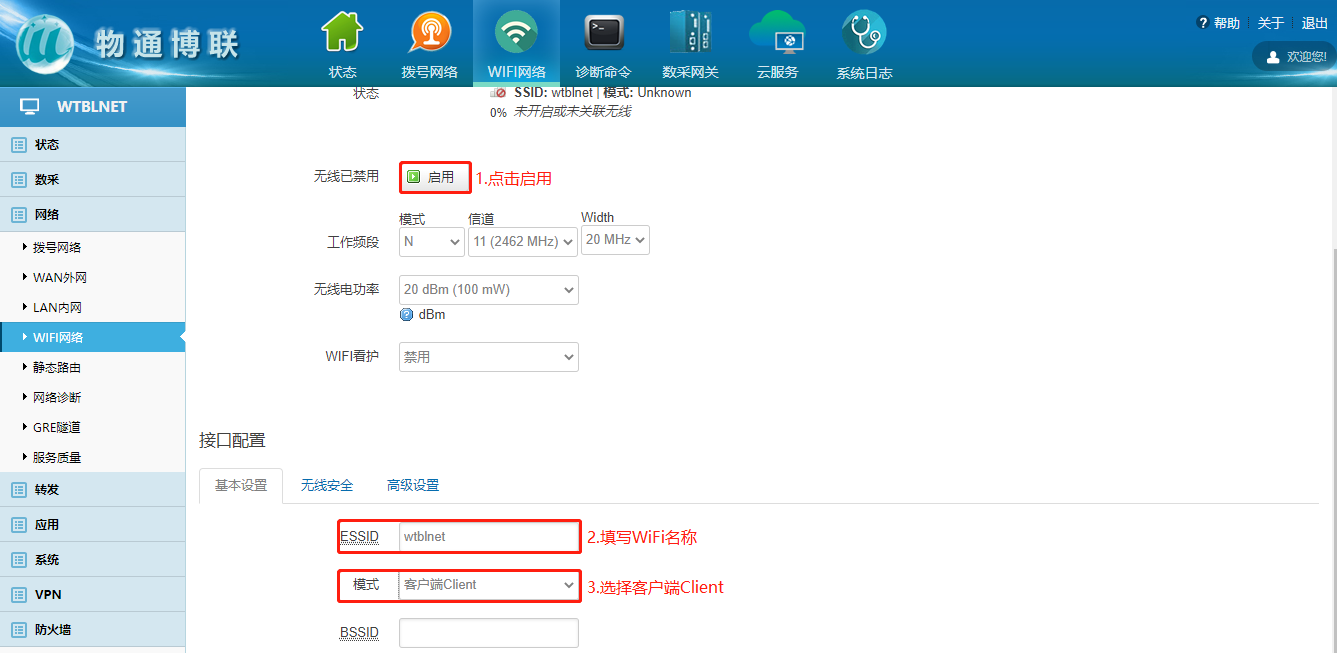 下载中心 视频中心 常见问题 售后服务 工业网关 设备快线 数据云平台 联网设备 问答百科 工业智能网关如何连接wifi热点? 时间:2022-10-26 09:15:30 点击:5234 关键词:工业智能网关,wifi 问题:工业智能网关如何连接wifi热点? 回答: (1)电脑顺利获得网线接入到网关LAN口,浏览器输入192.168.2.1默认地址 (2)登陆网关配置界面选择WiFi网络 (3)点击WiFi界面修改—进入WiFi配置界面 (4)启用WiFi—填写ESSID(WiFi名称)—模式选择客户端Client (5)点击无线安全—输入WiFi密码 注意:WiFi获取到的IP网段与网关LAN口的IP网段不能重复! 上一篇:工业智能网关如何更新程序和固件? 下一篇: 工业智能网关如何使用流量卡上网?