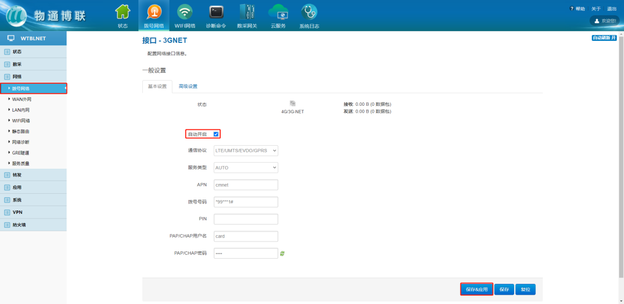下载中心 视频中心 常见问题 售后服务 工业网关 设备快线 数据云平台 联网设备 问答百科 工业智能网关如何使用流量卡上网? 时间:2022-10-26 09:15:30 点击:4685 关键词:工业网关,流量卡,网关配置 问题:工业智能网关如何使用流量卡上网? 回答: (1)电脑顺利获得网线接入到网关LAN口,浏览器输入192.168.2.1默认地址 (2)登陆到网关配置界面,点击网络—拨号网络—自动开启—保存应用 上一篇:工业智能网关如何连接wifi热点? 下一篇: 工业智能网关如何使用网线上网?