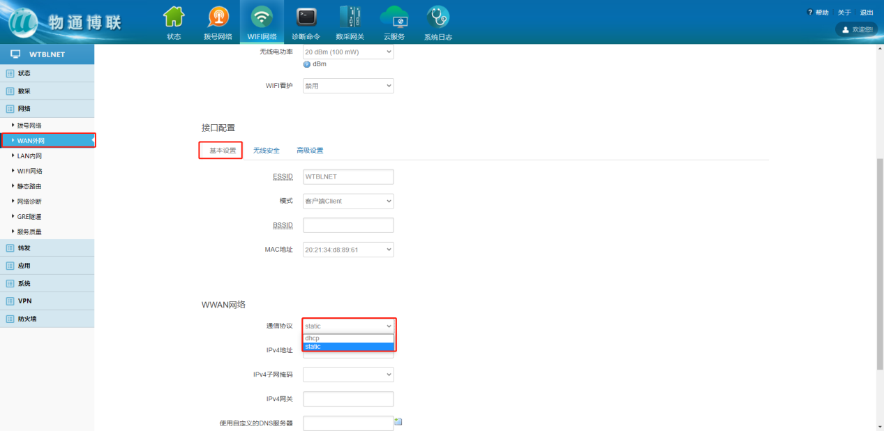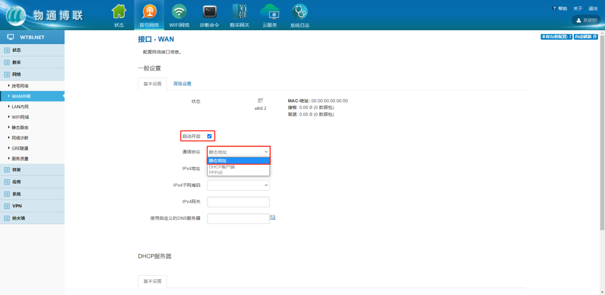 下载中心 视频中心 常见问题 售后服务 工业网关 设备快线 数据云平台 联网设备 问答百科 工业智能网关如何设置静态固定IP? 时间:2022-10-26 09:15:30 点击:4882 关键词:工业智能网关,静态固定IP,网关配置 问题:工业智能网关如何设置静态固定IP? 回答: (1)WAN外网设置静态IP 网络—WAN外网—切换通信协议——填写固定IP参数 (2)WiFi网络设置静态IP 网络—WiFi网络—修改—切换通信协议—填写静态IP 上一篇:工业智能网关如何使用网线上网? 下一篇: 工业智能网关如何进行软硬件复位?