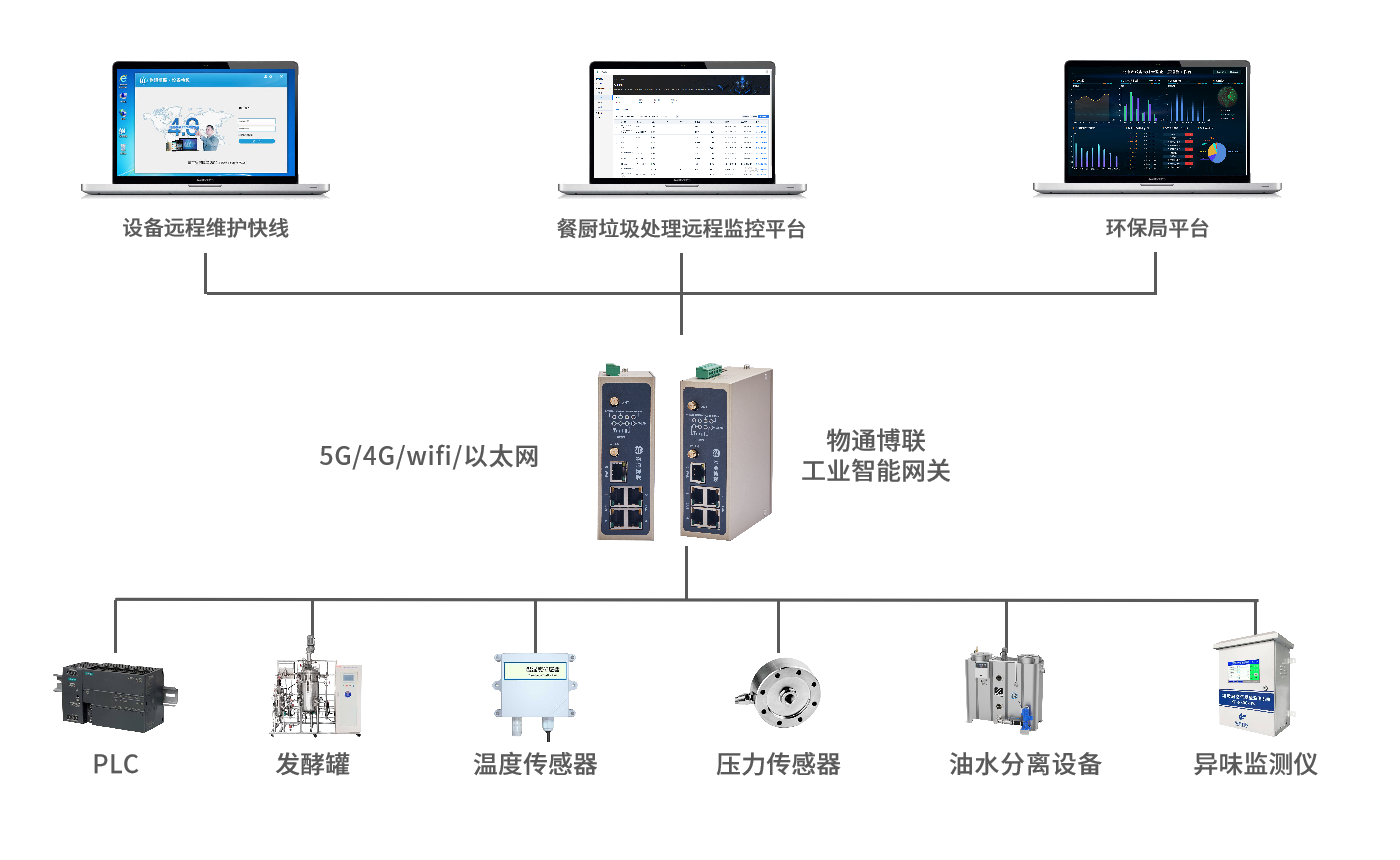 在餐厨垃圾处理设施中安装传感器和监测设备,顺利获得威九国际的工业智能网关采集处理设备(如发酵罐、油水分离设备等)的运行数据(如温度、转速、压力等)、餐厨垃圾处理量数据以及异味排放数据。将采集到的数据传输至餐厨垃圾处理远程监控平台,平台对数据进行实时分析和展示。当设备出现异常或异味排放超标时及时发出预警,对餐厨垃圾处理过程中的资源转化(如油脂提取、沼气产生等)进行评估,支持远程运营管理和故障维修。