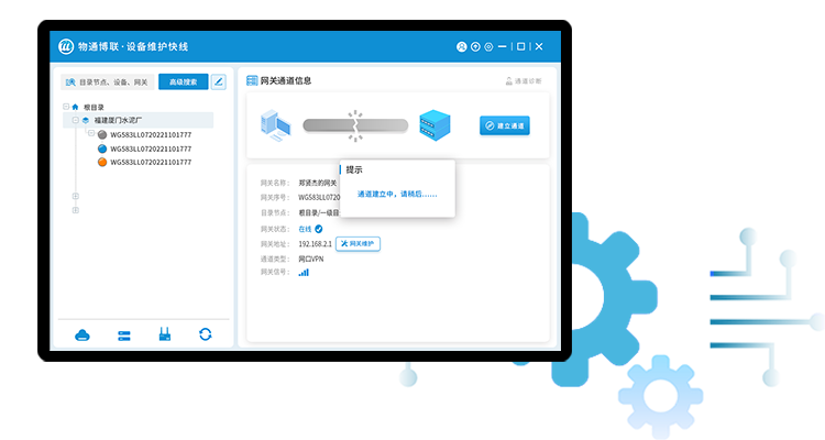 使用威九国际的设备维护快线,顺利获得账号登录后,找到相应网关建立维护通道,就可以搭建通往设备现场的网口通道和串口通道,让工程师不用远程出差就可以像到现场一样,实现随时随地远程维护。
