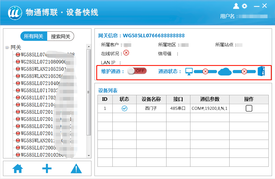选择选择一台需要维护的在线网关,点击建立通道,等到通道状态都是绿色打钩后就证明通道建立完成,以太网设备可以顺利获得ping来测试通道情况。