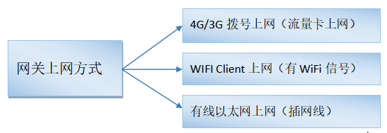 进入网关WEB管理界面(http://192.168.2.1/)设置联网方式,可选WIFI网络、3/4G网络(需要在网关通电前插入手机SIM卡,默认已开启3/4G网络)、WAN外网,三者只能选一个。