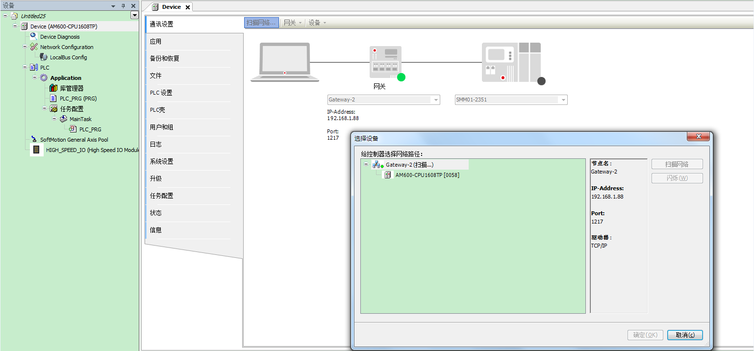 2、点击“Device”,进入通讯设置界面--点击“网关”--选择“添加网关”-进入网关设置界面,将PLC的IP设置成网关IP。(网关名称自定义)