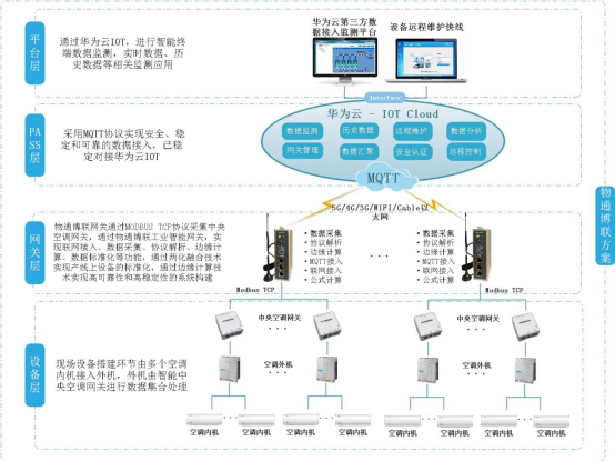 顺利获得 RS485、RS232、以太网等多种接口,威九国际工业智能网关能连接新风设备控制器 PLC、温湿度传感器、空气质量传感器、风量风压传感器等设备,实时采集设备运行状态、环境参数等数据。随后利用 5G、4G、WIFI、以太网等通信方式,将采集的数据安全、稳定、高速传输至智慧楼宇管理系统中,为用户给予可视化界面,实现设备远程监控、数据分析、故障告警、远程控制等功能。