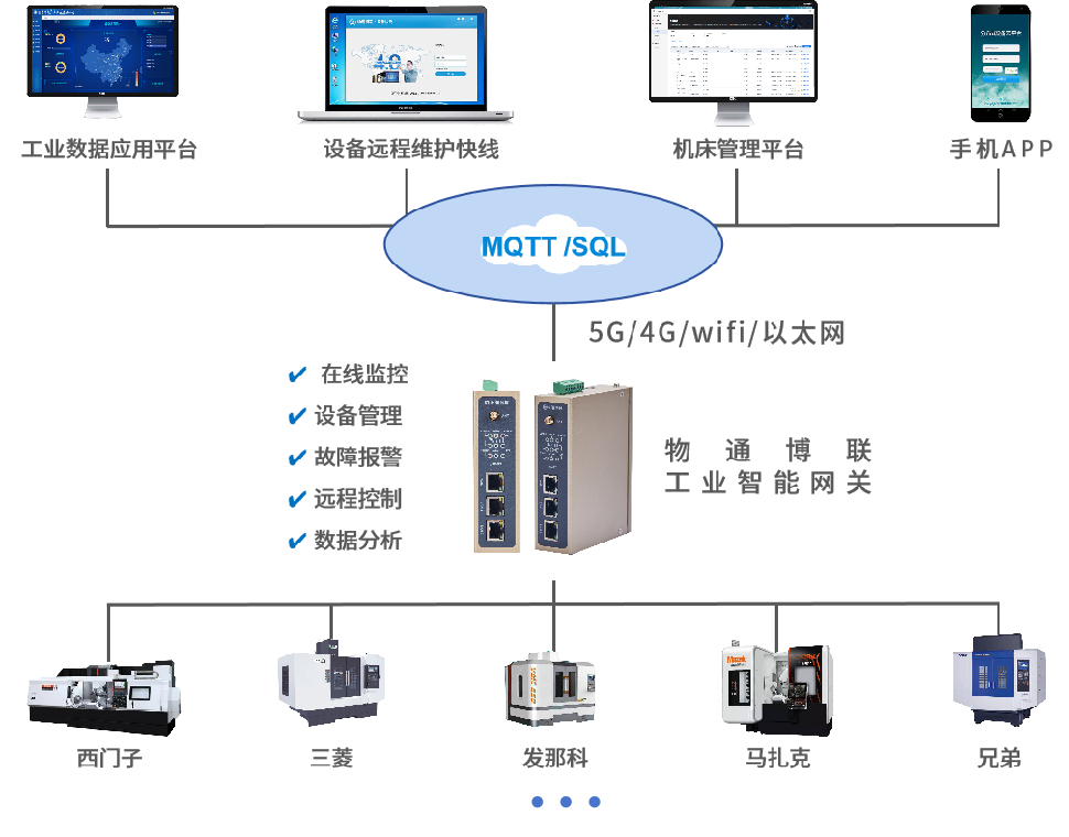 实时采集机床运行数据(机床状态、刀具状态、主轴状态、转速等),生产数据(班次加工数量、班次加工时间、总加工数量、总加工时间等),性能数据(时间稼动率、性能稼动率、OEE、良品率等),并顺利获得5G/4G/WIFI/以太网等方式对接到云平台或上位机中。