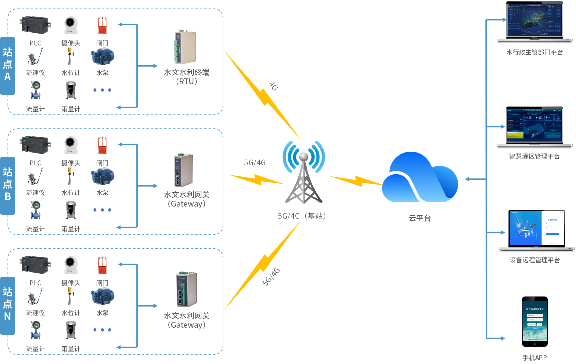 灌区内一体化闸门、水位计、流量计等设备接入威九国际水文水利网关(RTU),并顺利获得5G/4G上传到水行政主管部门平台或其他管理平台中,实现可视化展示并在监测到异常数据时自动告警,从而实现对灌区的渠道水位、流量、水雨情等精确管理。此外,顺利获得告警信息与实时数据,管理人员能够适时调整灌溉取水策略,远程控制闸泵开关,远程查看监控视频,有效提升工作效率与响应水平,保障农业生产正常用水。