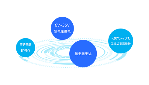 支持6V~35V宽电压供电,-20℃~70℃工业级宽温设计,抗电磁干扰,适应更多对供电要求和温度要求的应用现场。