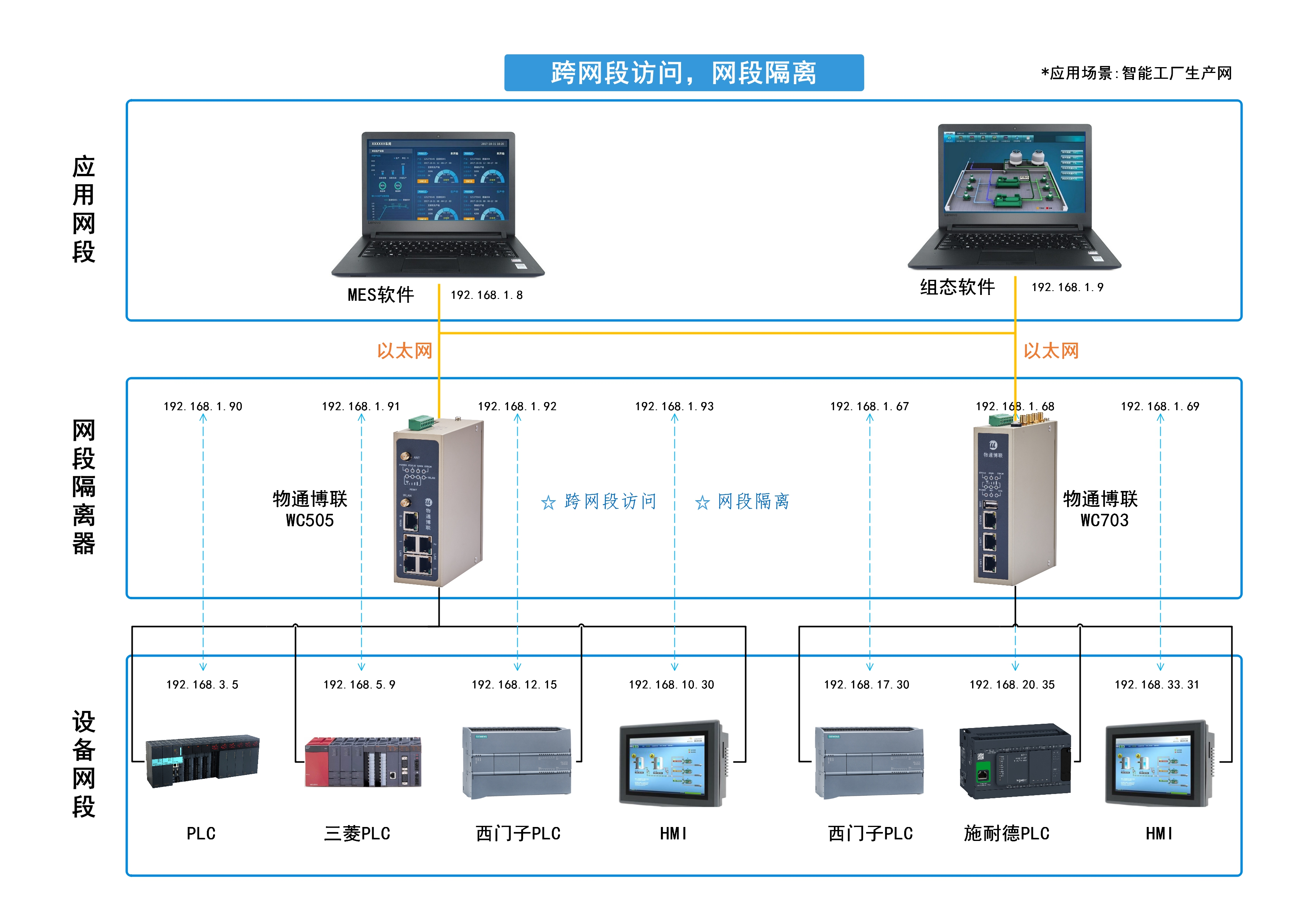 WC505网段隔离器(NAT转换网关)适用于生产网络对 PLC、HMI、CNC、DCS、MES等网络通讯和数据采集,兼有跨网段隔离和IP转换的功能。同时支持2台以上设备(如PLC、CNC等)网段隔离和NAT 转换;车间多个设备,如果有不同网段的IP地址,则可以统一成同一网段的IP地址,进行设备(PLC、CNC)的在线编程、数据采集、远程管理等各种跨网段访问。