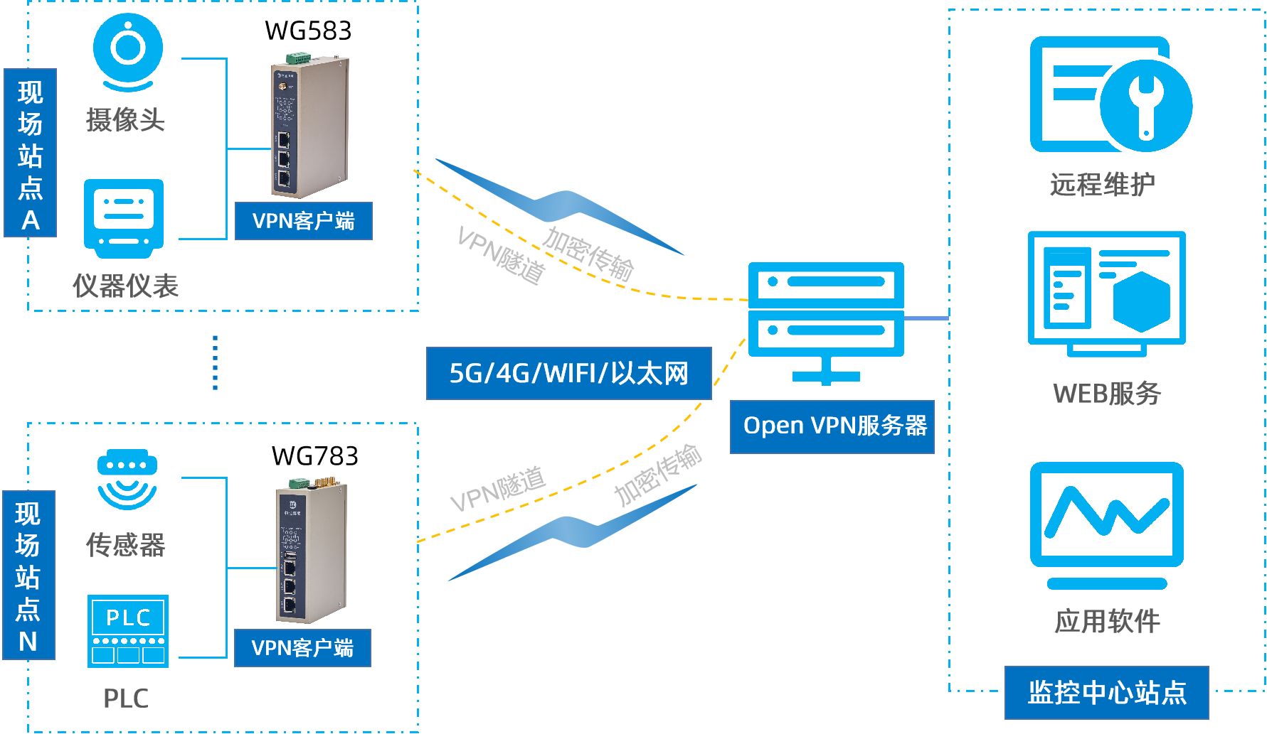 威九国际OpenVPN网关顺利获得对工业现场包括PLC、仪表、传感器或者工控机等在内的设备进行实时状态、参数、故障等数据的采集,顺利获得5G/4G/ WIFI/以太网等联网方式将数据上传至服务器进行储存(顺利获得网关为VPN客户端利用OpenVPN技术在原有网络基础上建立一个加密的虚拟网络通道,实现数据加密传输,保障数据的安全性和完整性),即可在数据中心将其显示、分析,从而分析现场环境以及现场设备的相关信息参数以及运行情况,实现对现场设备的远程监控、数据分析、远程维护。