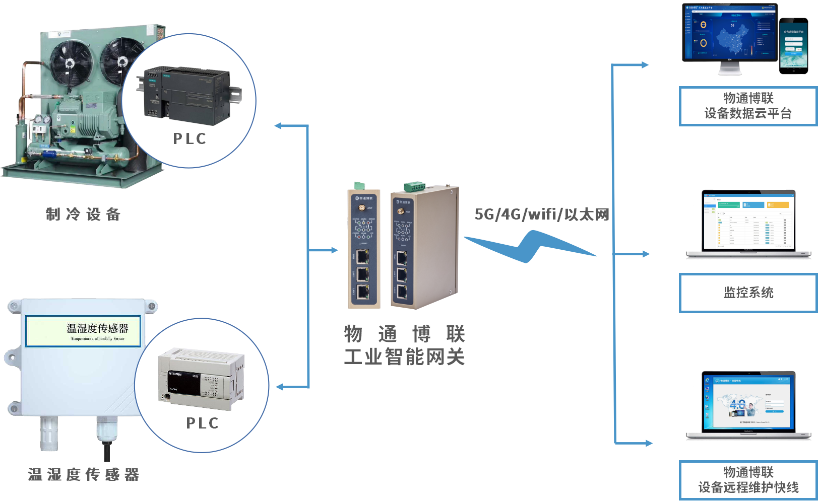 无论是食品冷链中的生产、运输还是存储环节,需要监测的设备都是制冷设备与传感器。顺利获得将威九国际工业智能网关接入制冷设备PLC与温湿度传感器,网关就能实时采集温湿度、压力及电压、电流等数据,并顺利获得5G/4G/WIFI/以太网等网络将数据传输到云端监控平台。