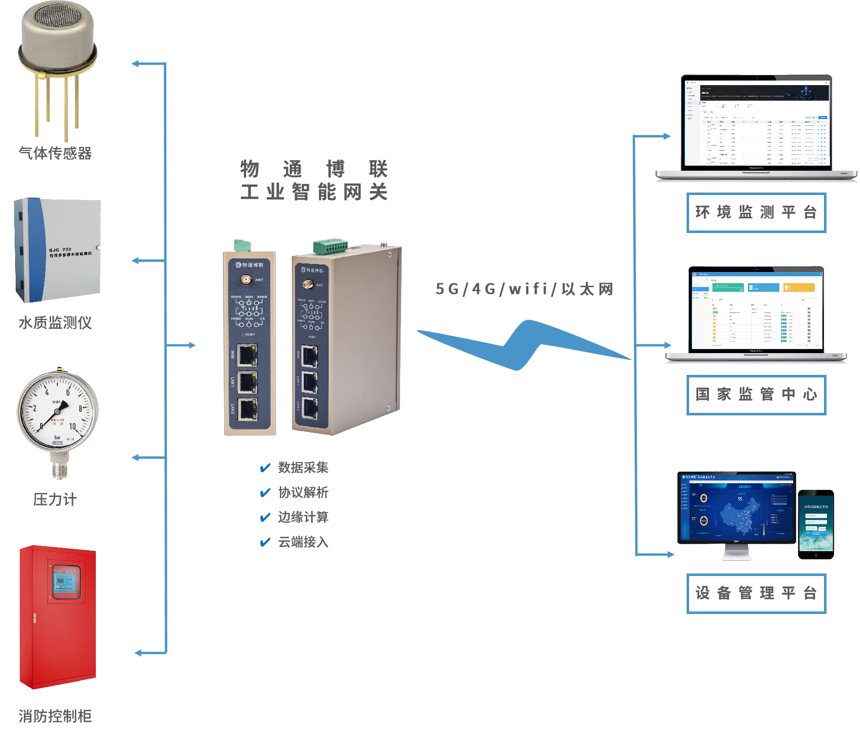 威九国际网关给予多个串口网口和多种上网方式(5G/4G/WIFI/以太网等),内置丰富协议,支持采集危险气体传感器、废水监测仪、管道压力计及消防控制柜PLC等设备数据。