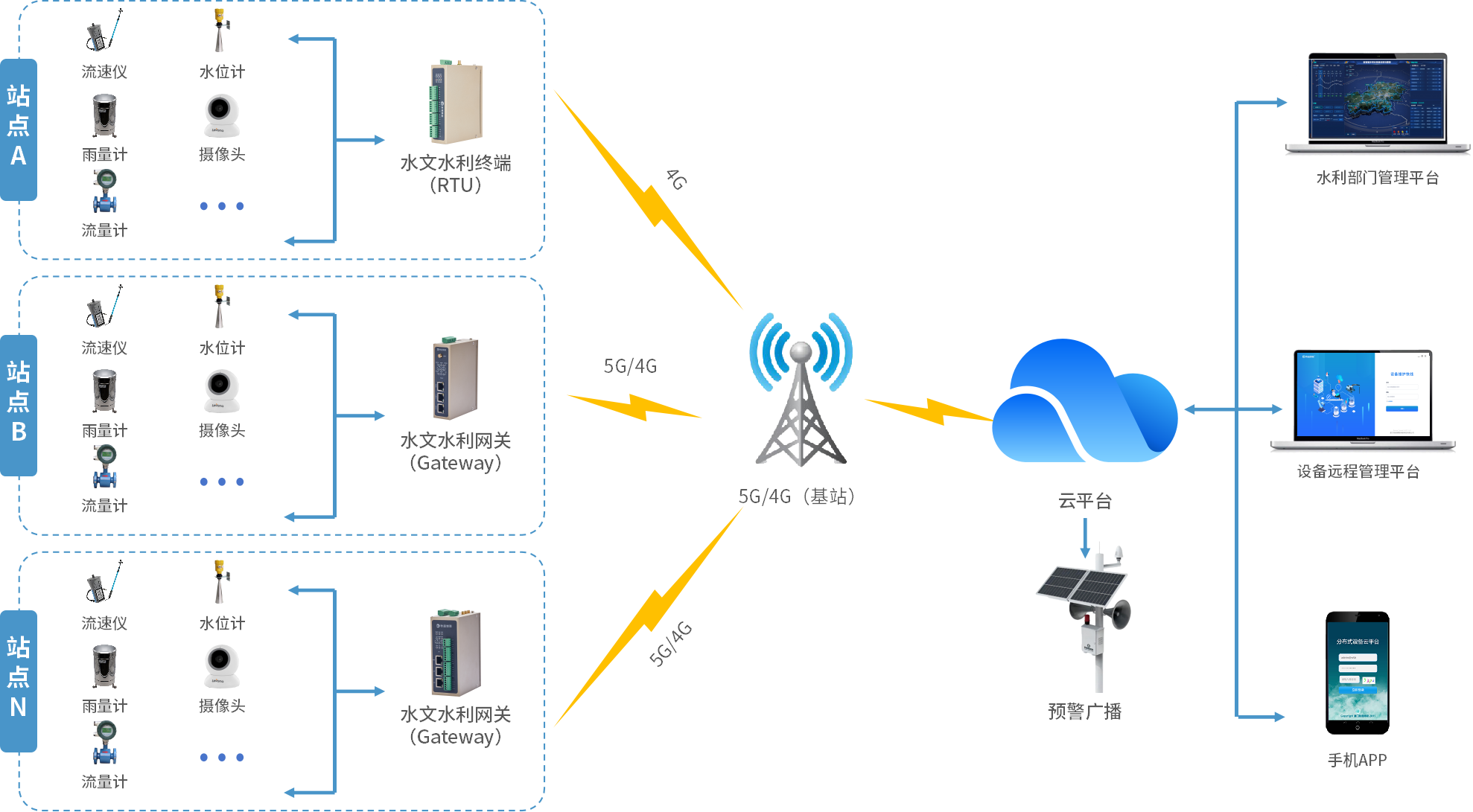 威九国际给予中小流域防汛防洪监测预警系统解决方案。顺利获得将水位计、流量计、雨量筒接入水利水文网关(RTU),实时采集水位、流量、雨量等数据并顺利获得 4G/5G等多种通讯方式实现传输汇聚到各级中小河流治理信息化管理平台,搭建起一张完整、精准、实时的水文监测网络,给予准确有效的防洪防汛预报预警,便于形成预案应对、灾害预演等数字化治理手段,加强中小流域防汛防洪治理水平与响应能力。