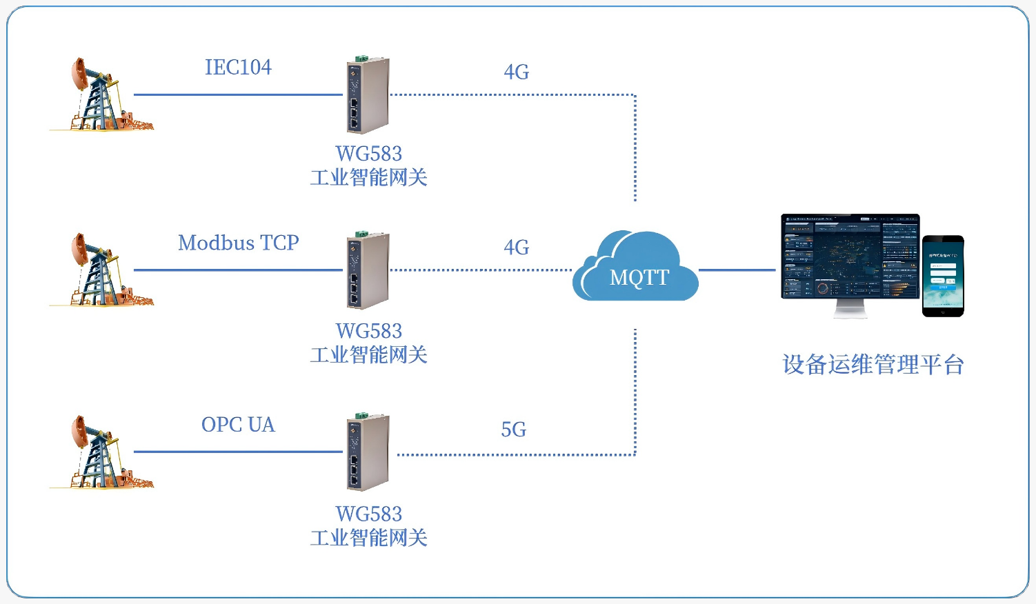 WG583网关支持边缘侧数据预处理,过滤无效数据并进行标准化转换,随后以5G/4G网络顺利获得轻量级MQTT物联网协议进行数据对接到智慧油田管理平台中,顺利获得多网互备、断网重连、断点续传、安全加密等多种功能,保障数据安全完整传输。